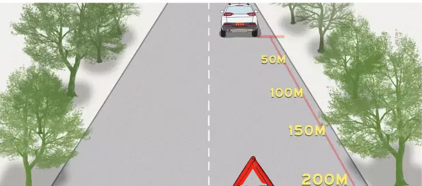 根據(jù)《中華人民共和國(guó)道路交通安全法》的規(guī)定,在常規(guī)道路上,發(fā)生故障或者發(fā)生交通事故時(shí),應(yīng)將三角警示牌設(shè)置在車后50米至100米處;而在高速公路上,則要在車后150米外的地方設(shè)置警示標(biāo)志,若遇上雨霧天氣,還得將距離提升到200米。
